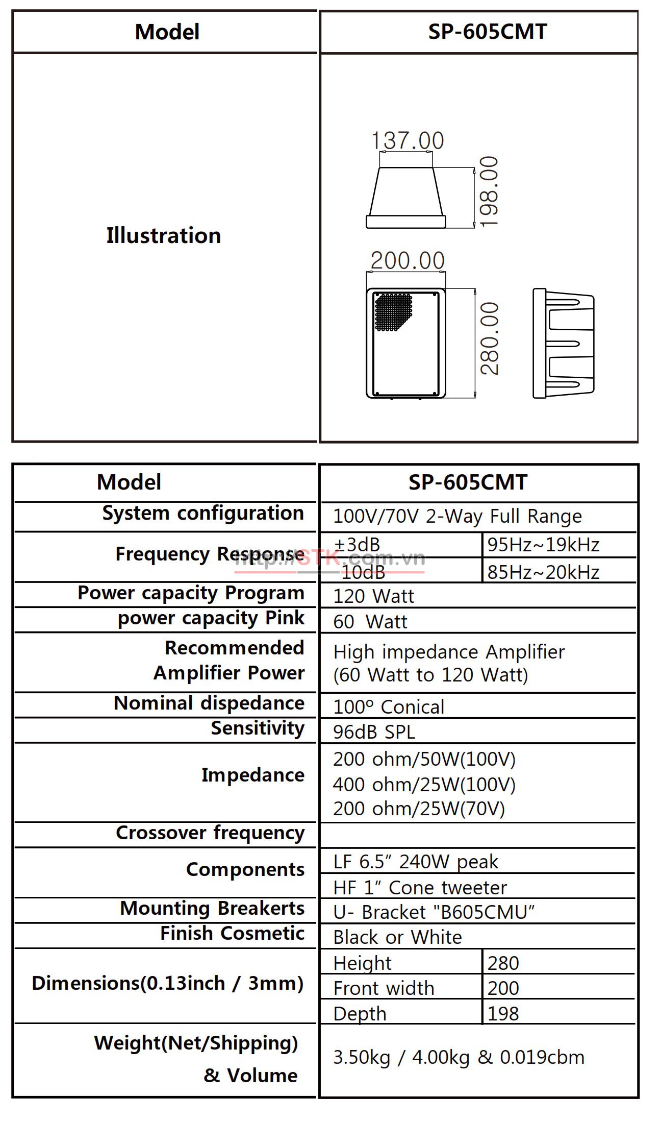 STK SP-605CMT là dòng loa thông báo của STK, loa dạng trở kháng cao với ngõ vào 70V/100V do loa được trang bị biến áp chất lượng cao.Loa SP-605CMT đem lại giọng nói và chất lượng âm nhạc Hi-Fi ở mức hoàn hảo.